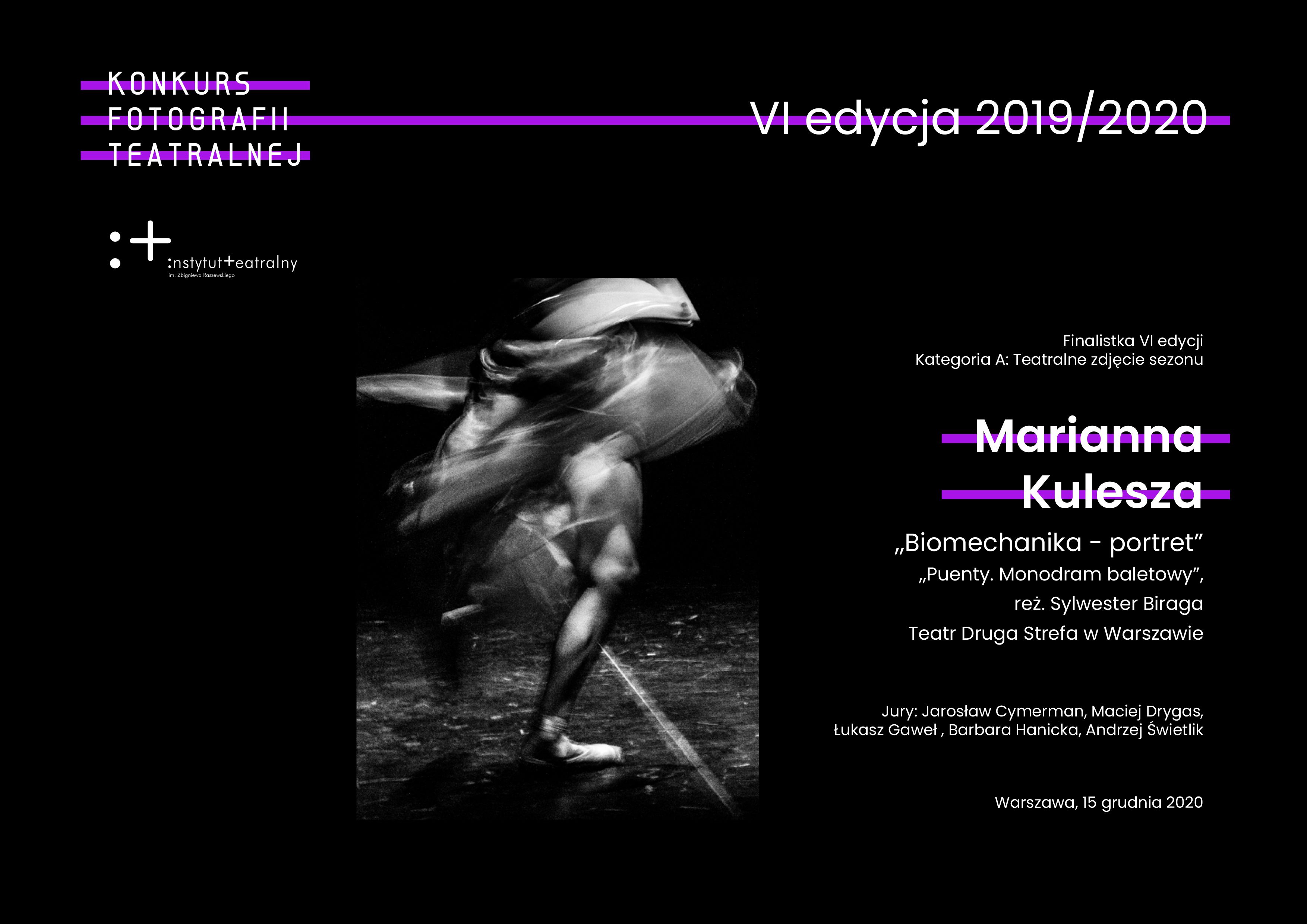 Dziękuję Krzysztofowi Bielińskiemu za wsparcie i zachęcanie do subiektywizmu w fotografii oraz uczestnikom Warsztatów Fotografii Teatralnej MasterClass za morze inspiracji. Dziękuję moim bliskim. Gratuluję wszystkim finalistom! Wszystkie zdjęcia finalistów można zobaczyć na stronie Instytutu: https://www.instytut-teatralny.pl/projekty/konkurs-fotografii-teatralnej-vi-edycja_2020-12-17